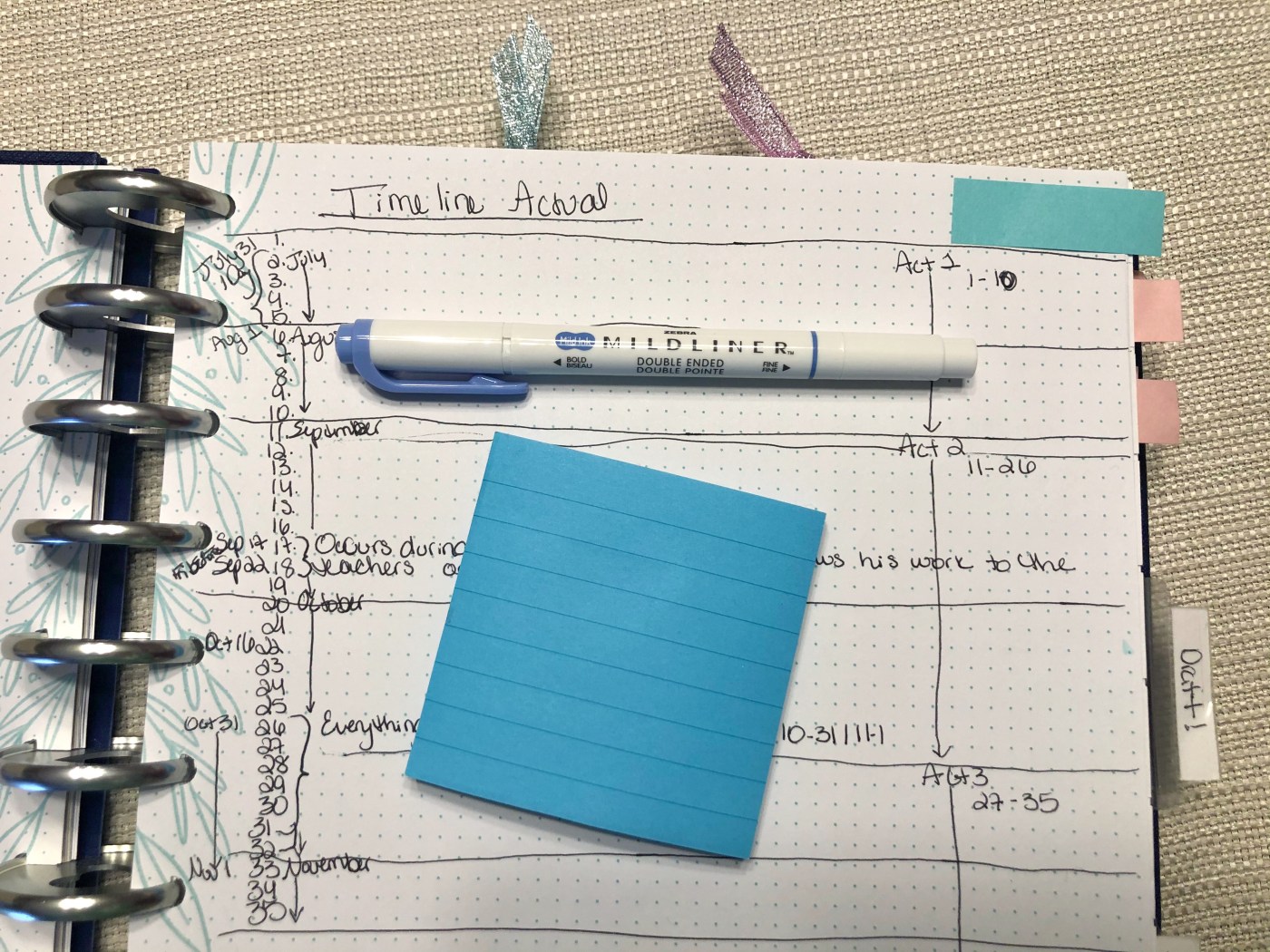 I started this piece of the process for two reasons. First was because I wanted to see what the physical timeline of the story was, as in how many days or weeks was there between key events within the story. Secondly, and really importantly, was because this story, being a magical story based on specific celebrations that happen on specific days of the year, I needed to see if the important moments were lining up with where they should happen in relation to those big celebrations. What wound up helping the most was writing out two different monthly spreads and then writing down within those weeks/months where the chapters were happening. With this method, I was able to see where the longer gaps were happening between events and take advantage of that space.